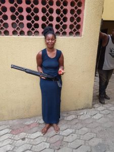 Gbamila Iyabo, f, 26, wife of the Number 1 of Aye Confraternity in Igbokuta, arrested with one pump action loaded with 8 rounds of cartridges,