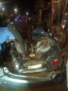 In a statement signed by the FRSC Public Education Officer, Route Commander Olabisi Sonusi said the crash left all the 4 occupants of the car trapped under the fallen truck. The 4 occupants trapped in the car has been rescued alive. They are being attended to by LASAMBUS.