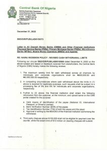 The CBN had on December 6, 2022 ordered Deposit Money Banks (DMOs) and other financial institutions to ensure that weekly over-the-counter (OTC) cash withdrawals by individuals and corporate entities do not exceed N100,000 and N500,000, respectively.