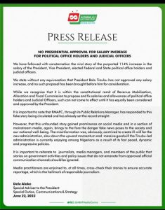 “We state without any equivocation that President Bola Tinubu has not approved any salary increase, and no such proposal has been brought before him for consideration,” a statement signed by the Special Adviser to the President on Special Duties, Communication and Strategy, Dele Alake, read on Thursday.