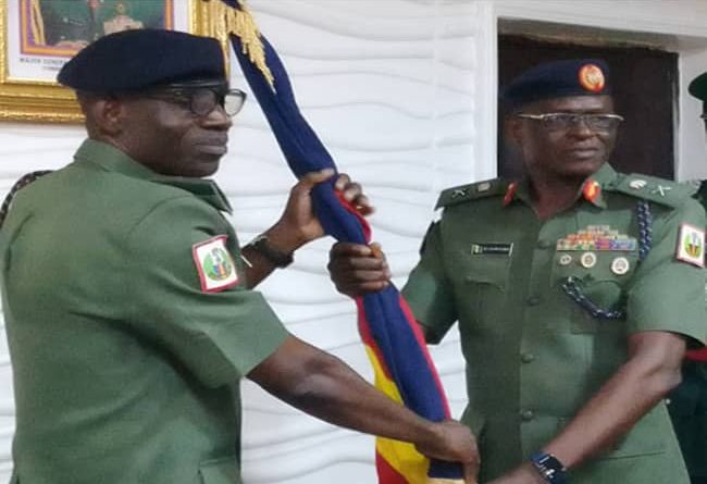 Major General AM Alabi handling over the flag to Major General Jonathan O. Ugwuoke