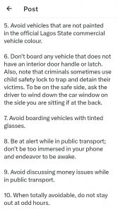 That passengers should avoid vehicles that are not painted in the official Lagos State commercial vehicle colour. “Don’t board any vehicle that does not have an interior door handle or latch.