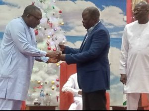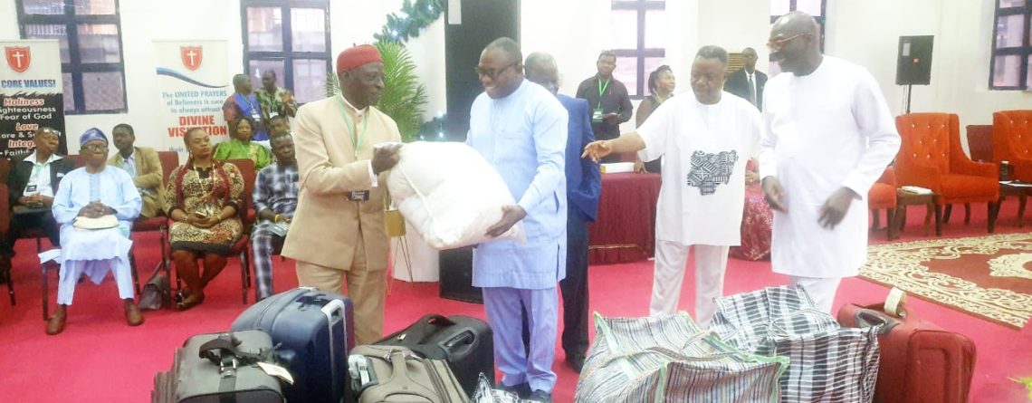 Dr Femi Ferguson presenting the gift Items on behalf of Senator Ade fadahunsi to Prof. Akuns