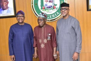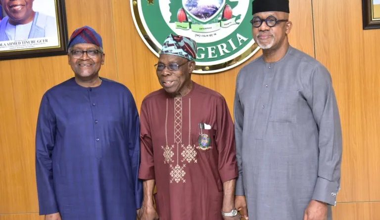 L-R: President/CE, Dangote Industries Ltd, Aliko Dangote, Former President, Olusegun Obasanjo, Ogun state State Governor, Prince Dapo Abiodun, during the President/CE of Dangote Industries Ltd and his team Visit Ogun state Governor,Abeokuta Ogun state on Monday 17 March 2025
